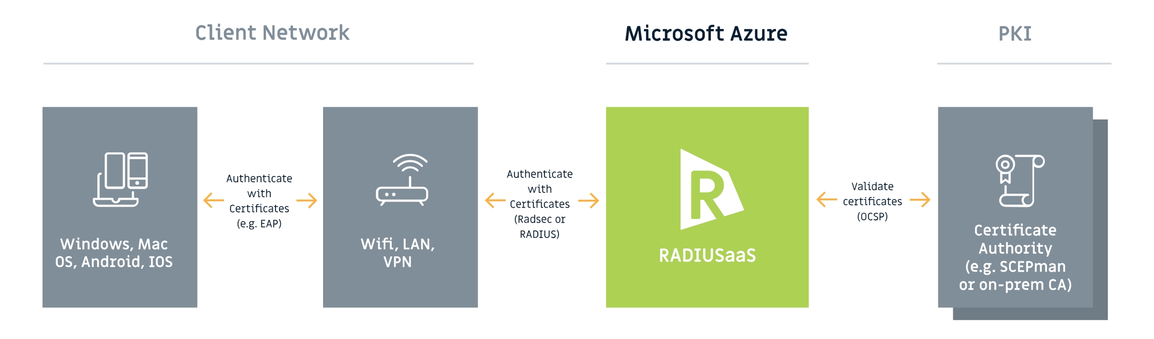 RADIUSaaS offers easy and secure authentication for accessing network resources. It delivers the comfort, reliability, and scalability of a native cloud SaaS. Supported protocols are RADIUS as well as RadSec. Authentication is based on certificates. RADIUSaaS is generally capable of validating every certificate that can be used for client authentication. However, to be able to lock someone with a revoked certificate out of your network, choose a CA which provides a publicly accessible OCSP or CRL endpoint.