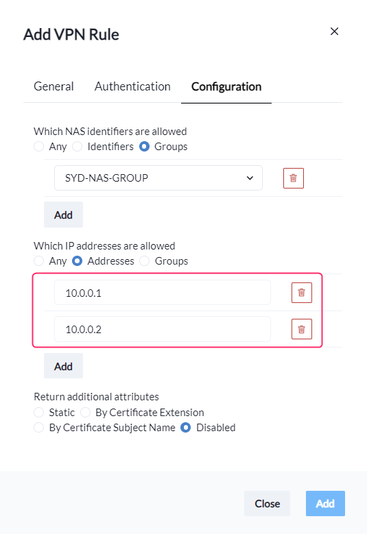 * If you select **Groups,** you can reference one or more of your pre-defined **NAS IP Address Groups**.