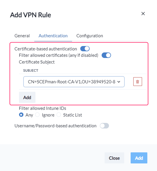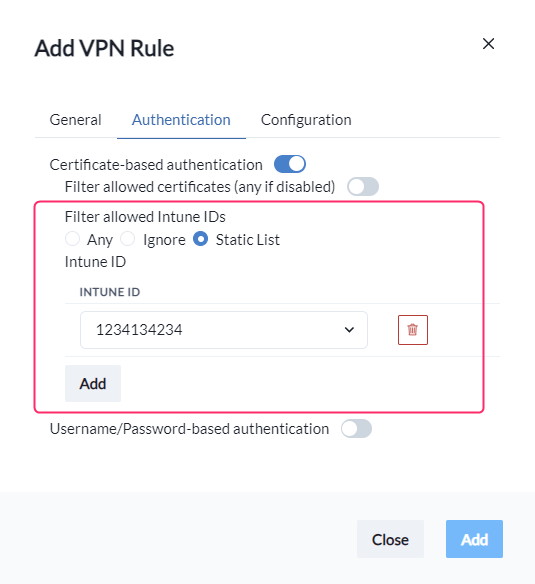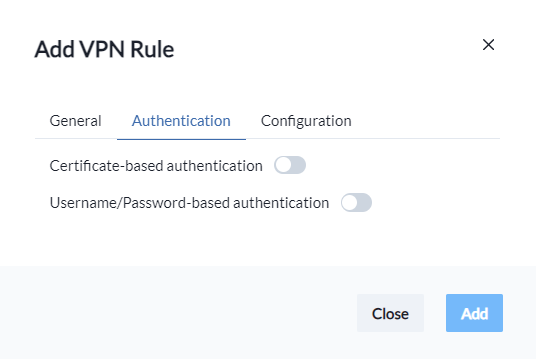 Under the **Authentication** hive, your first choice is whether you want to allow or decline **Certificate-based** or **Username/Password-based** authentication for this rule.