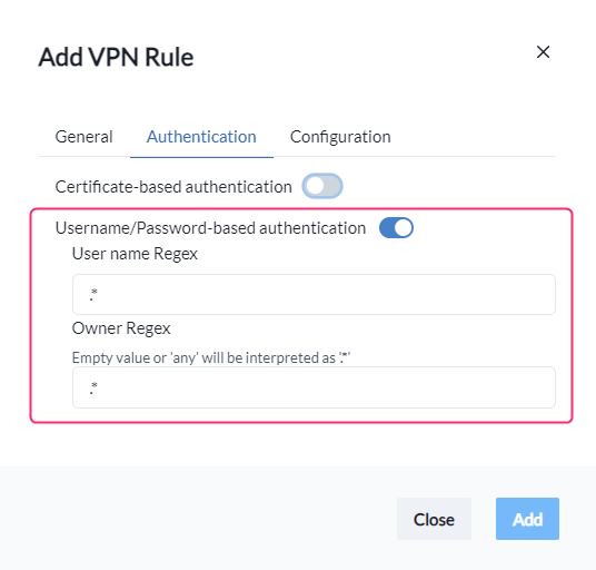After enabling **Username/Password-based** authentication, you can apply additional filtering by configuring a Regex on the **Username**. Default is all Usernames.