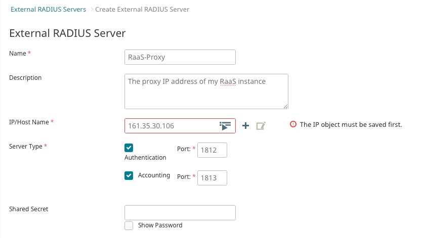 Go to Configure > Common Objects > Authentication > External Radius Servers and click Add
