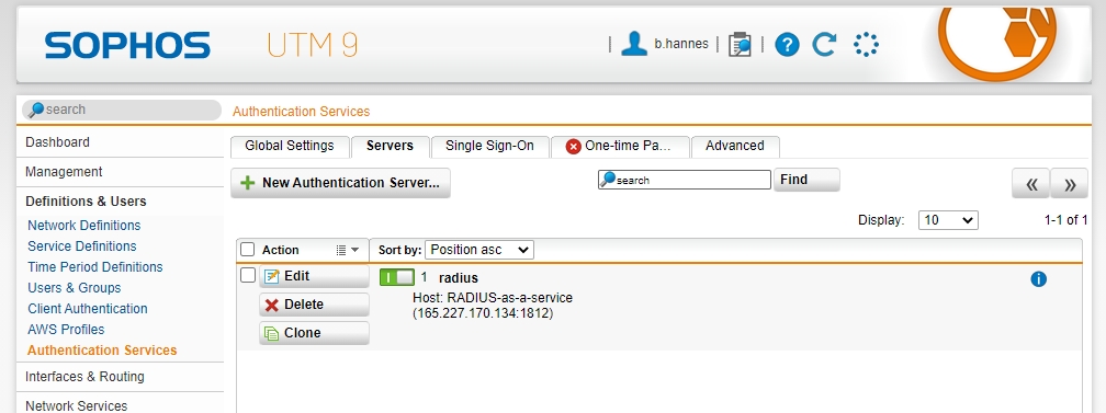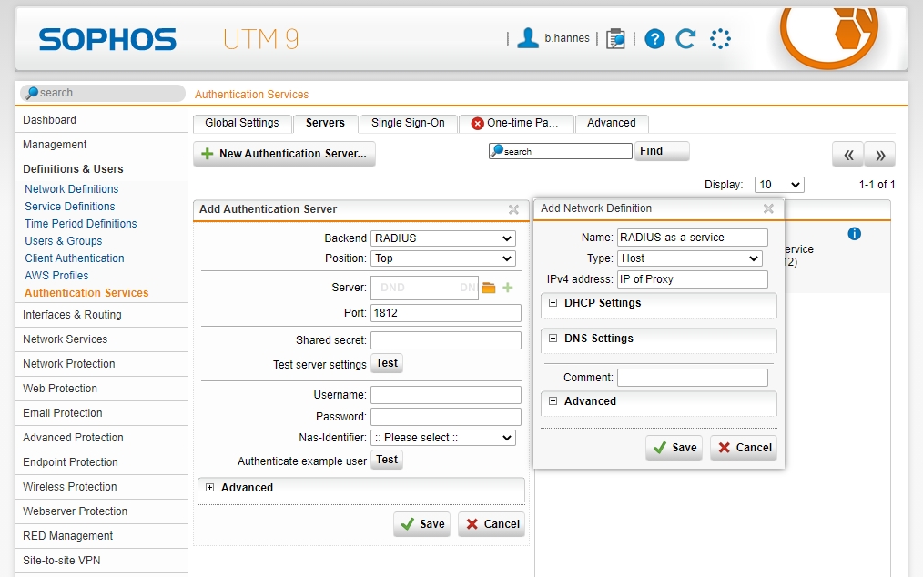 In Sophos navigate to Definitions & Users and select Authentication Services and select the tab Servers
