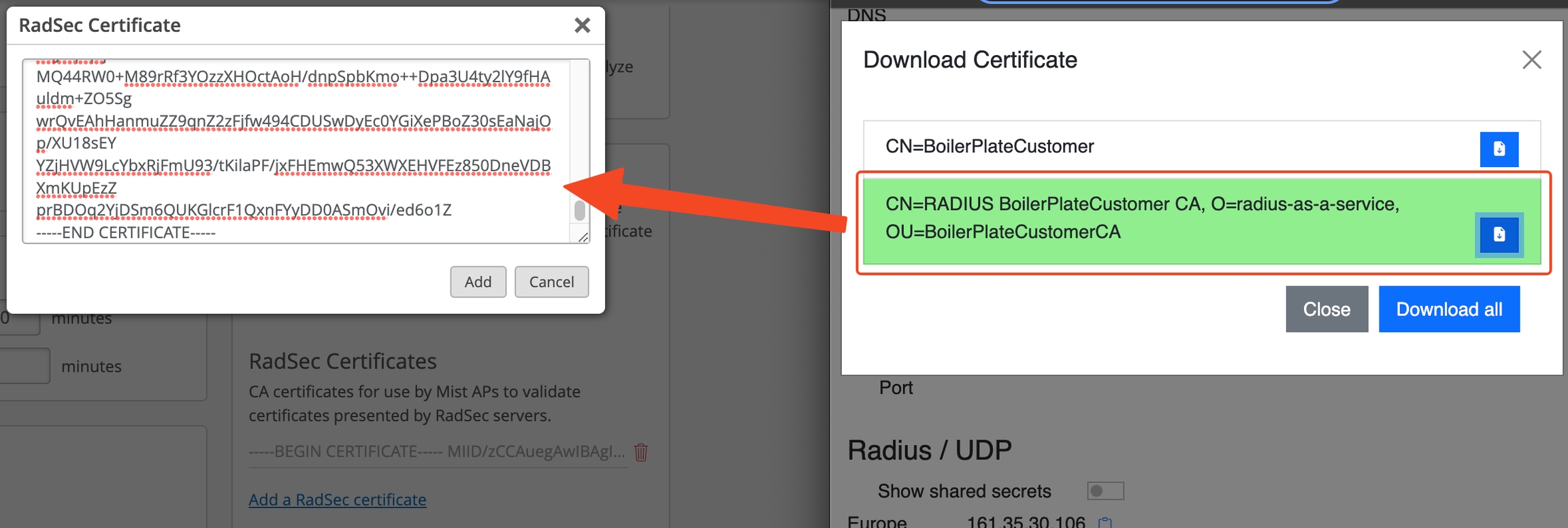 Add the root certificate of the CA that has issued your RADIUS Server Certificate under RadSec Certificate.
