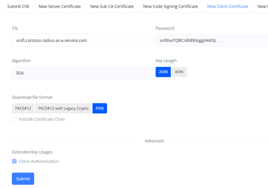 2. Create a **RadSec Client Certificate** for your access points. If you are using **SCEPman Certificate Master**, the process is described [here](https://docs.scepman.com/certificate-deployment/certificate-master/client-certificate-pkcs-12).\