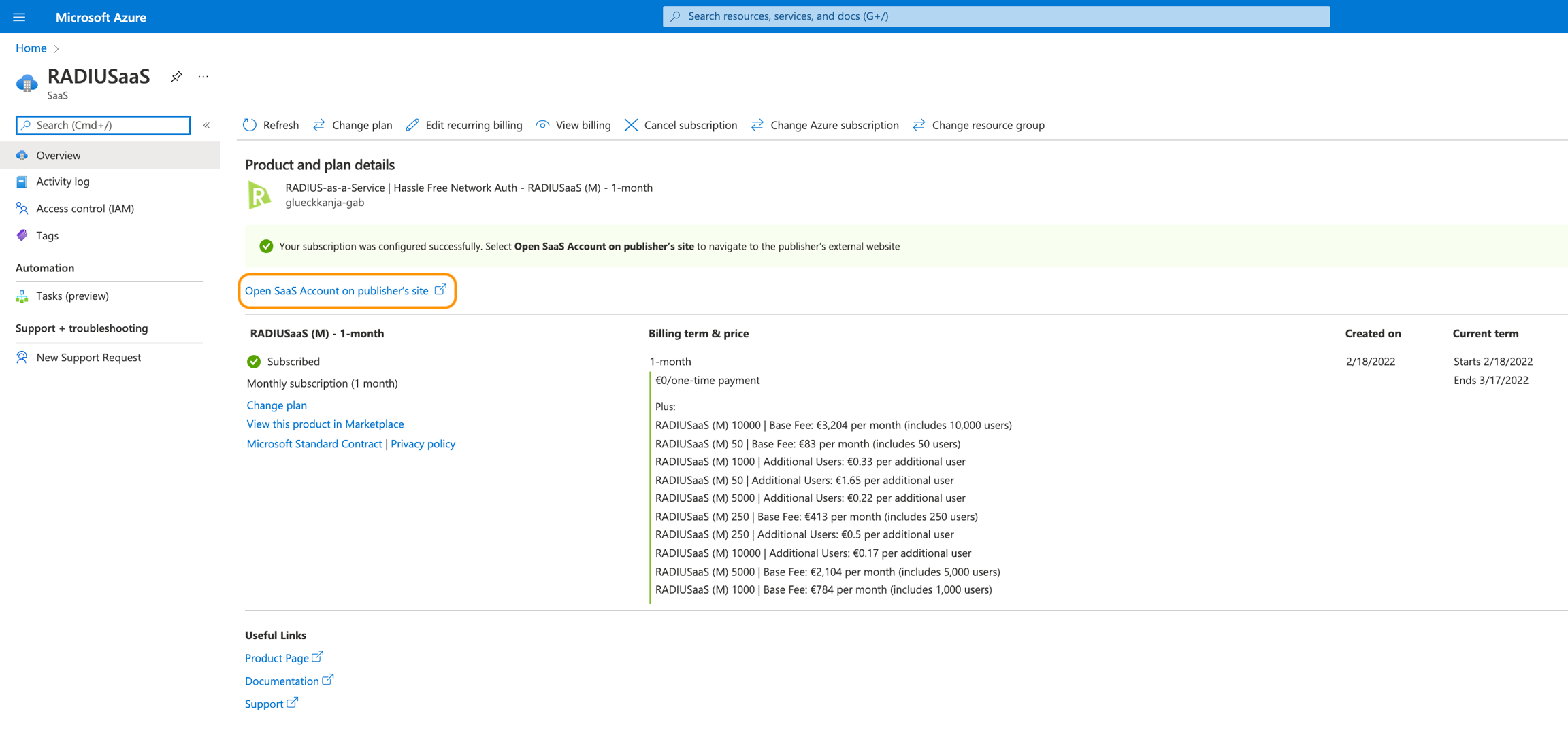 If you would like to upgrade your user count, you can do that any time during the current subscription cycle by navigating to your RADIUSaaS subscription in the Azure SaaS portal and by clicking "Open SaaS Account on publisher's site" (see screenshot below). This will re-direct you to our platform where the amount of users can be upgraded.