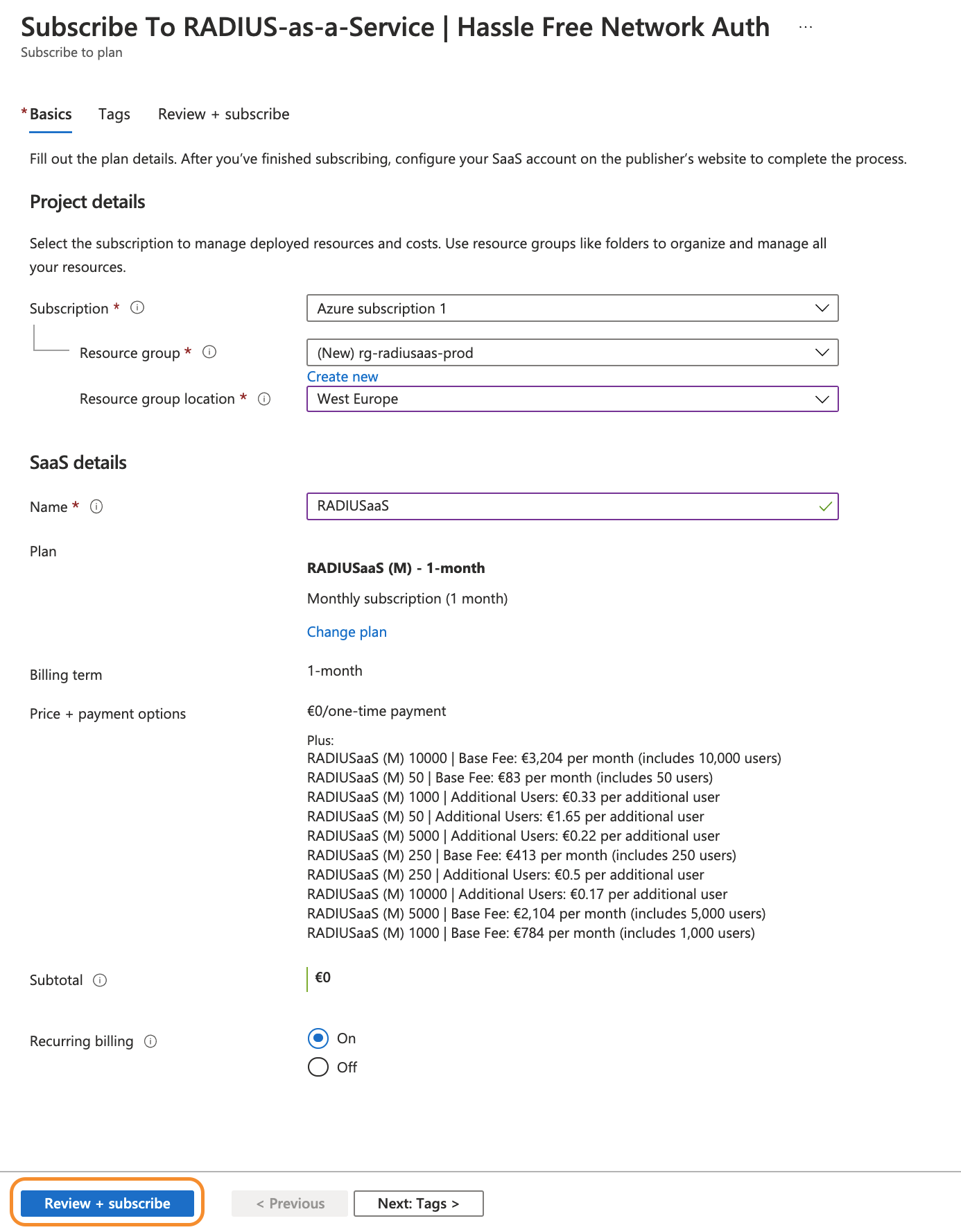 Subscriptions for RADIUSaaS are available based on a monthly or annual renewal interval.