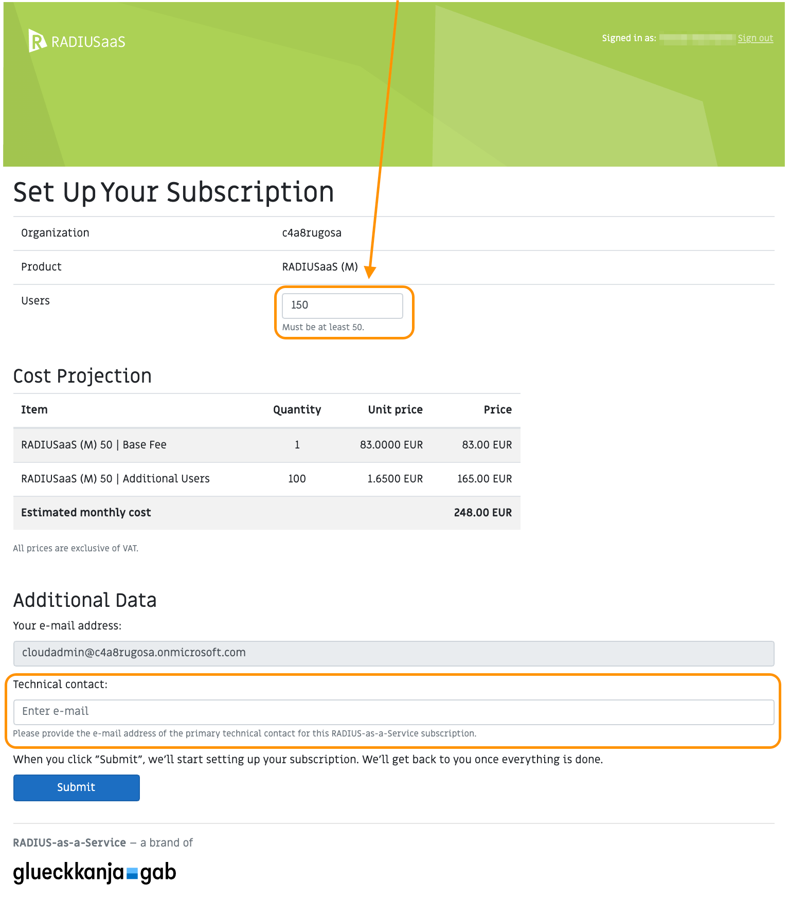 The Technical contact must have a mailbox connected to it, so we are able to notify you in case there are relevant issues with RADIUSaaS. By default, we also configure the Technical contact as initial administrator on your RADIUSaaS instance. In case you'd like to change that, please let us know.