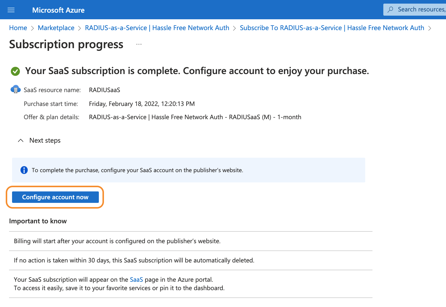 This triggers us to deploy your RADIUSaaS instance (and issue a SCEPman Enterprise Edition license key if the RADIUSaaS and SCEPman Bundle is purchased). We will inform you via email with all relevant information on the next steps once the instance (and license key) is available for you. This won't take any longer than one business day.