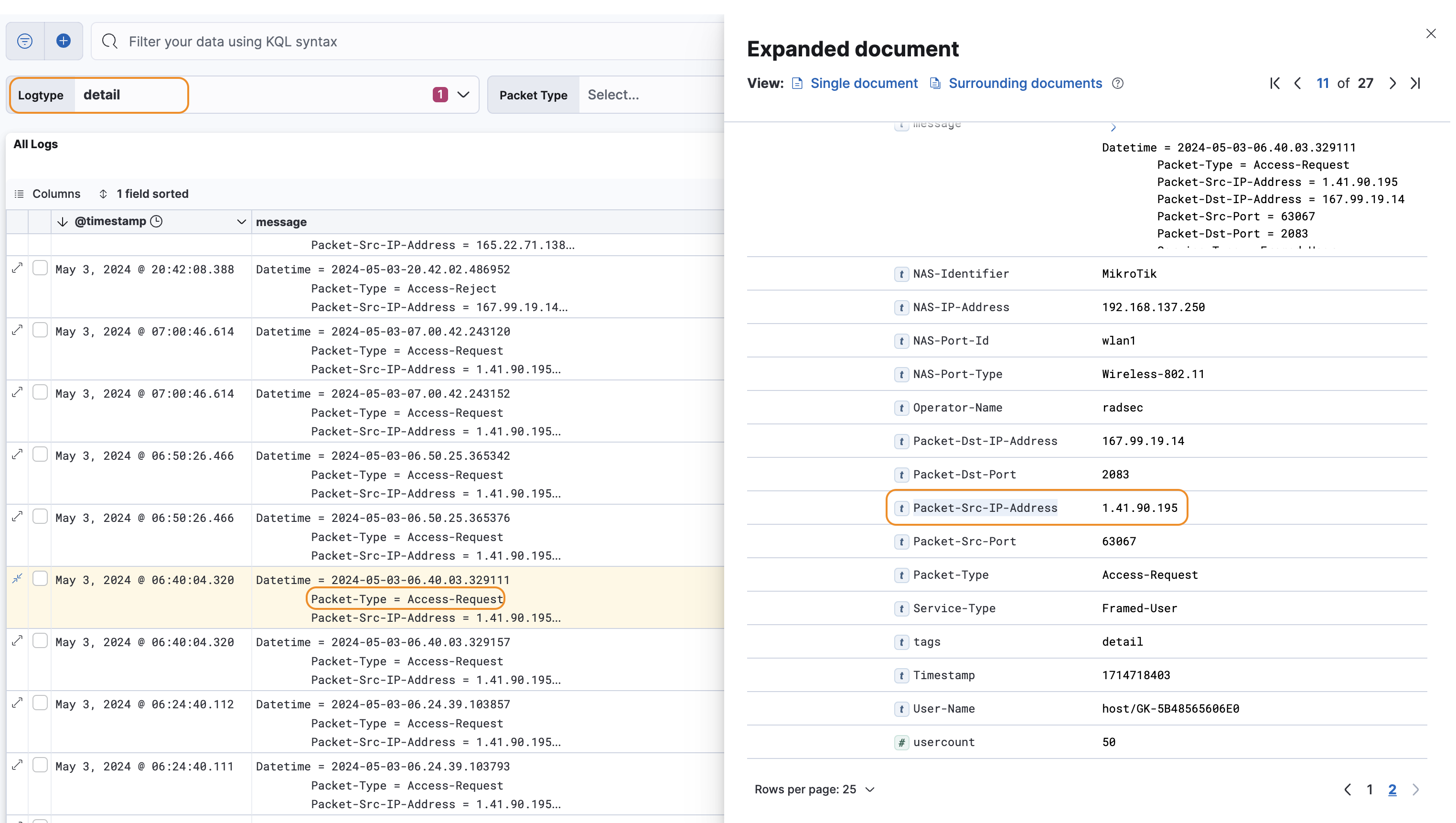 * The public IP can be extracted from the **message > Packet-Src-IP-Address** property of the log entry.<br>