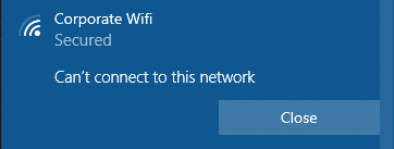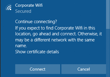 Continue connecting? If you expect to find Corporate WiFi in this location, go ahead and connect. Otherwise, it may be a different network with the same name.