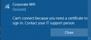 Can't connect because you need a certificate to sign in. Contact your IT support person.