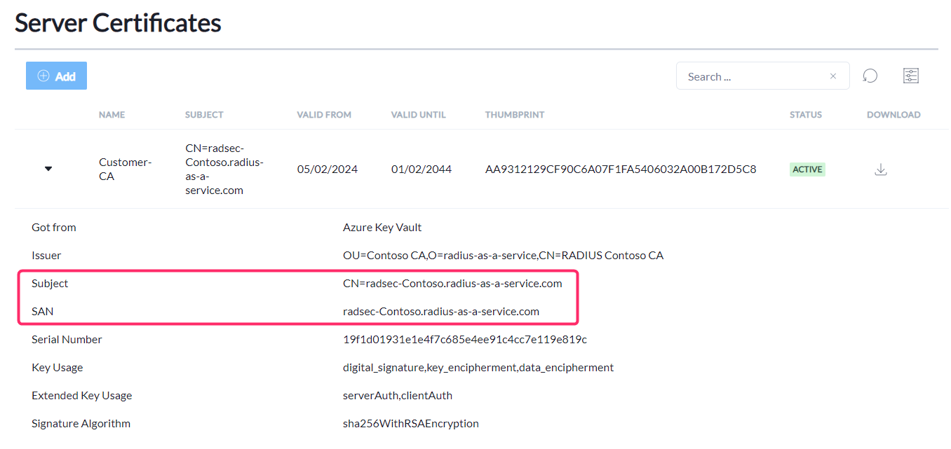 of your active RADIUS Server Certificate. These properties can be found by expanding the active server certificate and copying the relevant values. See screenshot below.