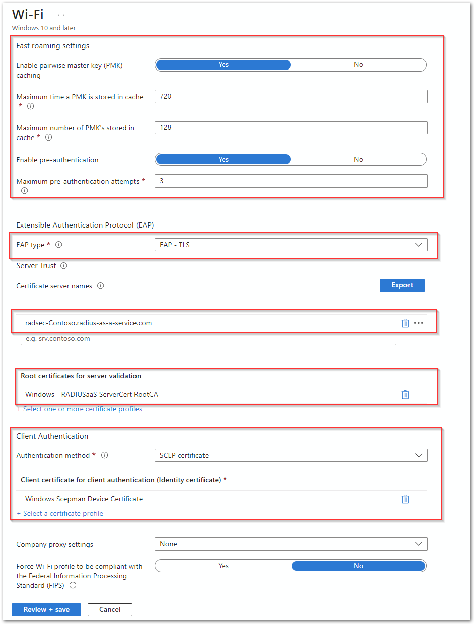 14. Finally for **Client certificate for client authentication (Identity certificate),** select the SCEP profile you would like to use for authentication.